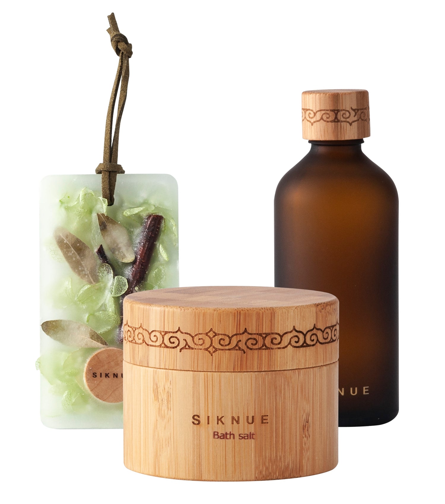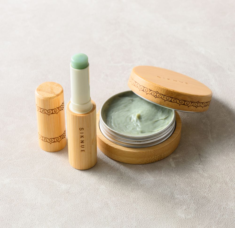 SIKNUE(シクヌ)はヨモギ、熊笹、鮭コラーゲン、スズランなど、北海道の天然原料を配合したブランドです。木製ボトルには美しいアイヌ紋様が刻印されています。