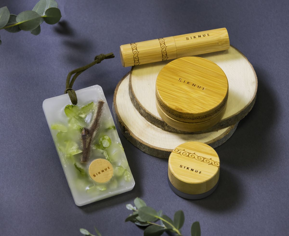 SIKNUE(シクヌ)は北海道の大自然に育まれアイヌ民族にも親しみのあるヨモギ、熊笹、鮭のコラーゲン、スズランなどをシンボル成分としています。